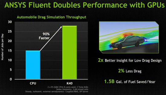 Сравнение скорости моделирования аэродинамического сопротивления в программе ANSYS FLUENT на двух процессорах Intel Xeon E5-2680 и двух ускорителях Nvidia Tesla K40 (изображение: videocardz.com).