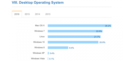 Согласно результатам исследования, проведённого ресурсом Stack Overflow, на сегодняшний день операционная система OS X пользуется большей популярностью среди разработчиков, чем Linux. Так, OS X использует 26,2% специалистов, в то время как Linux - 21,7%. На втором месте находится Windows 7 с 22,5%, однако, если принять во внимание все версии ОС от Microsoft, то на них работает около 52,1% девелоперов. Для данного отчёта было опрошено более чем 56 000 разработчиков из 173 стран мира, что является крупнейшим исследованием в истории компании.