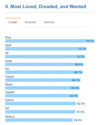 Что касается мобильного сегмента, то разработка приложений для Android остаётся по-прежнему более популярной среди разработчиков, чем для iOS - 61,9% против 47,5% соответственно. При этом почти треть разработчиков использует язык программирования Swift от Apple, который находится на втором месте после Rust.