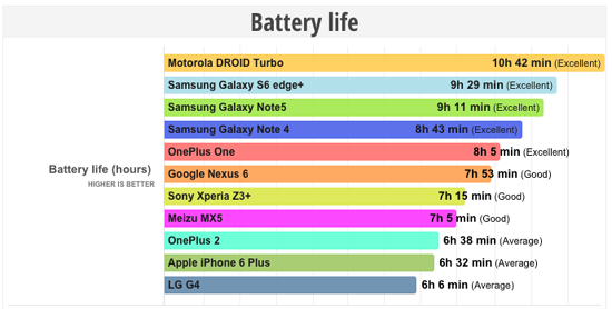 Тестирование показало, что OnePlus 2 способен продержаться на плаву в течение 6 часов 40 минут, тогда как прошлогодний One со своим 3100-мАч элементом питания живет приличных 8 часов 15 минут. Даже Google Nexus 6 опережает OnePlus 2, не говоря уже о прочих смартфонах. Впрочем, более слабыми оказались Apple iPhone 6 Plus и LG G4.