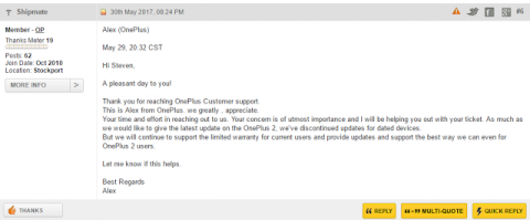 "Забота о вас имеет для нас первостепенное значение, и я помогу вам с вашей проблемой. Мы настолько сильно хотели бы выпустить последнее обновление для OnePlus 2, однако мы прекратили выпуск обновлений для устаревших устройств. Но мы будем продолжать поддерживать ограниченную гарантию для текущих пользователей и предоставлять обновления и поддержку на лучшем уровне, который мы можем обеспечить даже на OnePlus 2", - ответил представитель службы поддержки OnePlus.