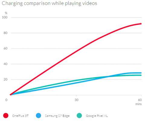 Однако логичнее всего сравнивать OnePlus 3T с Google Pixel XL, так как оба смартфона оснащены Snapdragon 821, 5,5-дюймовым AMOLED-дисплеем и примерно одинаковыми аккумуляторами (3 400 мАч у OnePlus 3T и 3 450 мАч у Pixel XL). Компания OnePlus настолько уверена в своём превосходстве, что даже сняла видео, чтобы продемонстрировать преимущество нового OnePlus 3T в плане скорости зарядки в сравнении с конкурентом от Google.