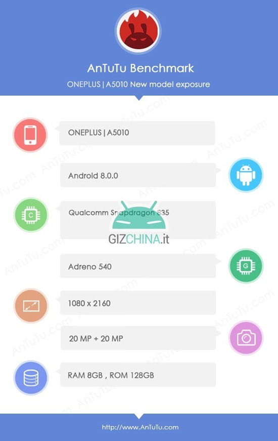 Синтетический тест идентифицировал девайс как аппарат с модельным номером A5010, который обладает экраном разрешением 2160х1080 точек (FullHD+), процессором Snapdragon 835 с графикой Adreno 540, 8 Гб оперативной памяти и 128 Гб постоянной. Получит новинка 20 Мп основную камеру, фронтальный модуль на 20 Мп (у предшественника 16 Мп) и важным новшеством станет предустановленная операционная система Android 8.0 Oreo. Выглядит информация достаточно правдоподобно и, возможно, что именно таким и предстанет OnePlus 5T. На данный момент сам производитель предпочитает хранить молчание о времени выхода смартфона, как впрочем, и не дал он четкого ответа, так выйдет эта модель в нынешнем году или ее появление лишь плод фантазии энтузиастов. Хочется верить, что в самое ближайшее время OnePlus внесет ясность в этом вопросе.
