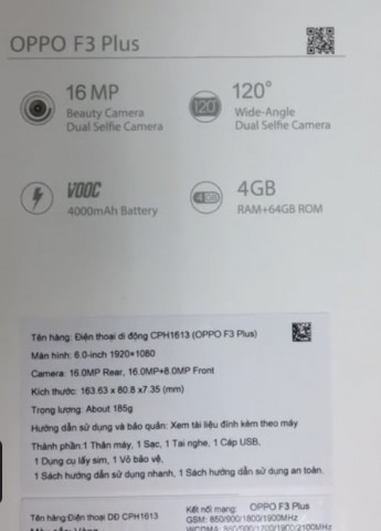 Кроме того, в сеть попал снимок упаковки Oppo F3 Plus с демонстрацией входящих в комплект аксессуаров: USB-вилка и кабель для зарядки, наушники, а также прозрачный силиконовый чехол.