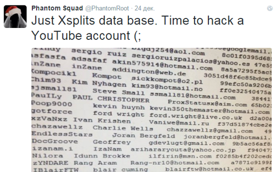 Если верить заявлению Phantom Squad в Twitter, группировке также удалось получить доступ к базе данных стриминговой платформы XSplit. Операторы сервиса факт атаки не подтверждают.