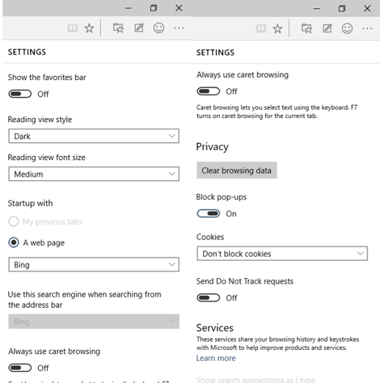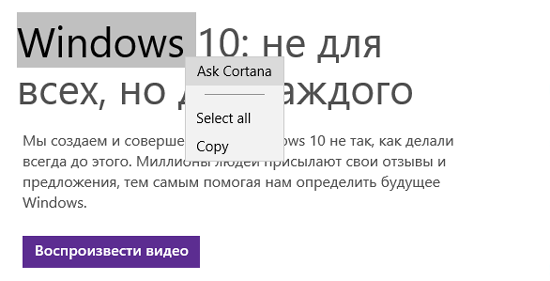 Самой интересной возможностью, на мой взгляд, является интеграция с сервисом Cortana (аналог голосового ассистента Siri и голос одноименного персонажа серии игра Halo для приставок от Microsoft). При выделении какого-либо слова на странице можно нажать правой кнопкой мышки и выбрать пункт “Ask Cortana” (Спросить Кортану). После этого в правой части браузера появится меню ассистента с результатами поискового запроса. Работает, надо заметить, очень даже хорошо. Cortana выдает не только информацию о поисковой выдаче, но и структурирует ее, по аналогии с Siri. Если это бренд — будет приведена заметка из Wiki, а чуть ниже — результаты поиска в Интернете, а затем последние новости. На данный момент сервис работает исключительно в Америке. Поэтому для русскоговорящих пользователей представляет не сильно большой интерес.