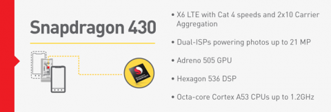 Qualcomm Snapdragon 430 получил восемь ядер Cortex-A53 с тактовой частотой 1,2 ГГц, новый графический ускоритель Adreno 505, цифровой сигнальный процессор Hexagon 536 DSP, поддержку камер с разрешением до 21 Мп и модем X6 с поддержкой LTE Cat. 4. Первые устройства на базе этого процессора появятся только в следующем году.