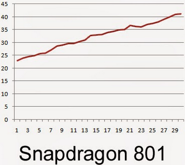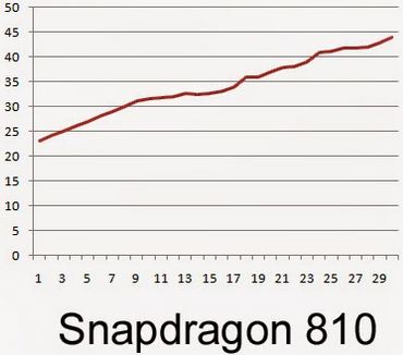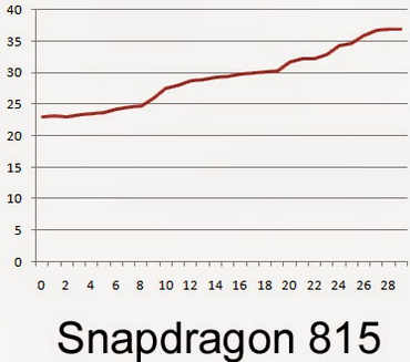 В новом тесте приняли участие процессоры Qualcomm Snapdragon 815, Snapdragon 810 и Snapdragon 801. Они были установлены в референтных устройствах с 5-дюймовым Full HD-экраном и 3 ГБ оперативной памяти. В образцах, вероятно, отсутствовали беспроводные модули и антенны, поэтому в реальных условиях температура процессора может оказаться несколько выше. На всех трёх смартфонах была запущена игра Asphalt 8 с высокими настройками графики. Температура на процессорах замерялась непрерывно в течение 30 минут. По истечении этого времени Snapdragon 801 нагрелся до 42°С, Snapdragon 810 достиг отметки 44°С, в то время как Snapdragon 815 не преодолел и 38°С.
