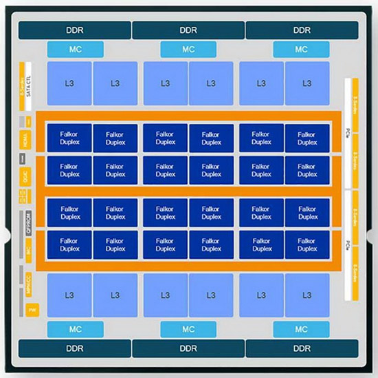 Так, теперь известно, что этот чип будет производиться с использованием 10-нанометрового техпроцесса, и главной целевой аудиторией этого продукта станут поставщики облачных услуг и владельцы крупных ЦОД, для которых очень важную роль играют такие параметры, как энергопотребление и энергоэффективность процессоров. Замах Qualcomm взяла серьезный: если верить заявлениям, система на базе одного процессора Centriq сможет предложить уровень производительности, эквивалентный решениям на базе пары процессоров Xeon с архитектурой Skylake. В отличие от Intel, Qualcomm не обязана тянуть за собой тяжкое наследие совместимости с процессорами настольного класса и использует в своей разработке всё лучшее, что было воплощено в чипах для смартфонов и планшетов. Centriq 2400 должен получить 24 процессорных ядра с кодовым названием Falkor. Это архитектура собственной разработки Qualcomm, но отвечающая всем требованиям стандарта ARMv8.
