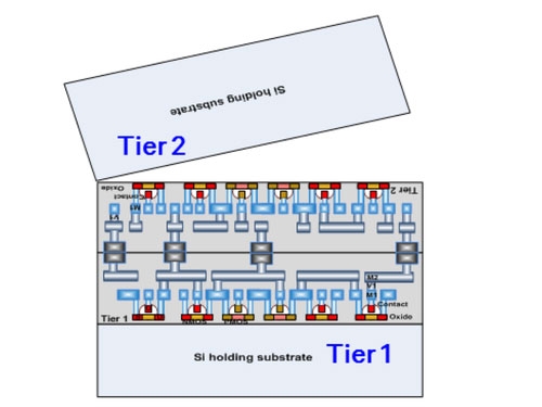 Компания рассматривает два варианта монтажа двух кристаллов (три кристалла могут паковаться в столбик только по специальным заказам и пока не рассматриваются в качестве популярного решения): последовательное (front-to-back, F2B) и встречное (front-to-front, FF). При последовательной компоновке сначала формируется нижний кристалл, а затем на его рабочую поверхность наносится слой в виде базовой подложки, на котором обычным методом формируется второй рабочий кристалл. При такой последовательности контактные переходы между верхним и нижним кристаллами сравнительно небольшие, но возникает другая проблема. Температура обработки кремниевой пластины порядка 1200 градусов по Цельсию, и медные дорожки и соединения нижнего слоя банально растекутся. Переходить на вольфрам вместо меди нежелательно из соображения снижения производительности, как и нельзя снижать температуру отжига, что тоже приведёт к деградации производительности.