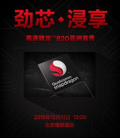 Сегодня в сети появилась информация о том, что компания Qualcomm планирует провести в Китае специальное мероприятие, посвященное Snapdragon 820. Судя по тизерному изображению, оно состоится 11 декабря. Предполагается, что в рамках пресс-конференции представители компании Qualcomm поделятся новой информацией о своем последнем флагманском мобильном чипе.
