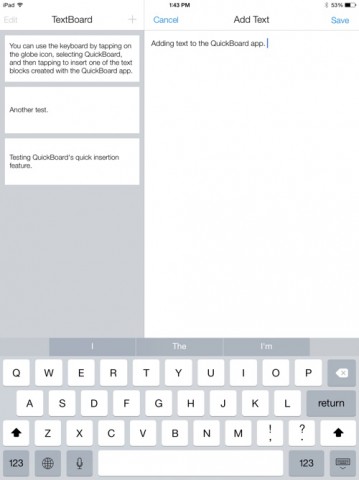 В клавиатуре QuickBoard имеется доступ к основным клавишам форматирования текста. Набор основного текста осуществляется с помощью алгоритма предиктивного ввода. В настоящий момент приложение находится на стадии бета-тестирования. Кевин Волкобер, разработчик данной программы, обещает представить конечный вариант к моменту запуска iOS 8.