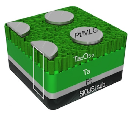 Как отмечают разработчики, предложенное устройство опережает конкурентные решения по производительности и ёмкости. Ключевым в новинке является специальная структура, которая обеспечивает сверхмалые токи утечки. При этом появляется возможность создавать массивы ёмкостью до 162 Гбит (или около 20 Гбайт). Многослойный стек включает металлический контакт (платиновый в прототипе) поверх изолирующего слоя двуокиси кремния, который, в свою очередь, ложится на стандартную кремниевую пластину. Сам металлический контакт покрывается чистым танталом с нанопористым слоем окиси тантала поверх него. Ещё десять атомарных слоёв графена (так называемый многослойный графен, MLG) ложатся сверху окиси тантала, а завершает этот стек ещё один металлический электрод (платиновый, но исследователи говорят, что возможны эксперименты с разными металлами).