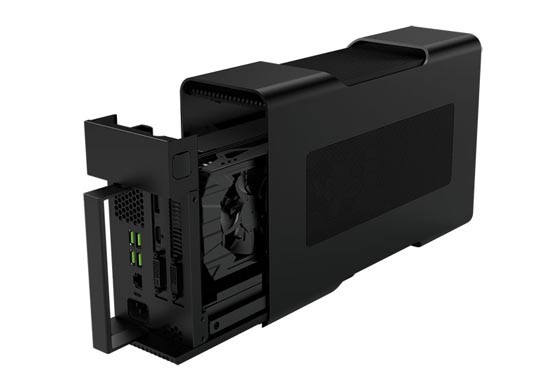 Чтобы превратить ноутбук в геймерский ПК, пользователю достаточно подключить ноутбук к внешней док-станции Razer Core, способной радикально увеличить производительность графики в играх. Небольшой блок содержит полноразмерную видеокарту GeForce и Radeon мощностью до 375 Вт, например, GTX 970 или Radeon R9 380. Изображение выводится через высокоскоростной интерфейс Thunderbolt 3, который позволяет передавать видеопоток со скоростью до 40 Гбит/с.