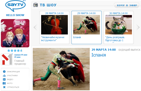 Телезрители музыкально-развлекательного телеканала М1 теперь имеют возможность выходить в эфир программы «Hello Show» через телевизионную социальную сеть SAY.TV. Возможность «живого» общения появилась благодаря технологиям SAY.TV. Начиная с 27 марта, каждый день на странице «Hello Show» на SAY.TV (say.tv/HelloShow) будут объявляться темы ближайших программ.