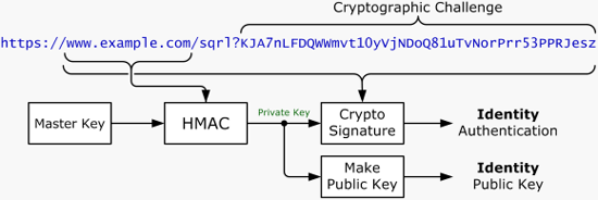 Несмотря на простоту, такой способ аутентификации гораздо безопаснее, чем обычный ввод имени пользователя и пароля, потому что по каналам связи передается не пароль, а хэш, сгенерированный на основе пароля пользователя (master key) и уникального одноразового кода, полученного из QR (одноразовый код добавляется в URL). Мобильное приложение SQRL генерирует хэш и отправляет его на сервер для аутентификации.