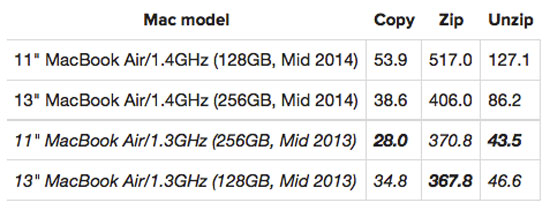 Во всех тестах на скорость работы с файлами – копирование, сжатие в архив и распаковка – новые 11-дюймовые и 13-дюймовые MacBook Air оказались медленнее своих предшественников, выпущенных в середине 2013 года.