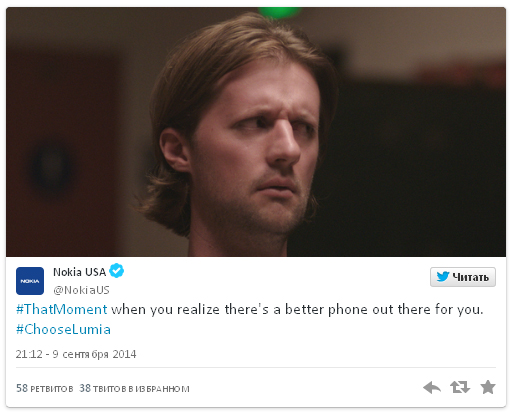 Американское подразделение Nokia, например, не смогло придумать ничего задорнее, чем разместить картинку с подписью: «Тот самый момент, когда понимаешь, что телефон получше уже был выпущен ранее».