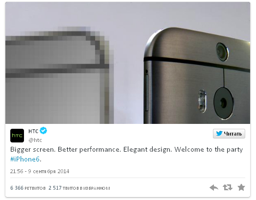 HTC чаще всего пишут в таких случаях чепуху, лишь бы отметиться и на этот раз они ничем не удивили. Рядом с фото iPhone 6 разместили снимок своего HTC One (M8) и накропали подпись: «Больший экран. Выше производительность. Элегантный дизайн. Добро пожаловать на вечеринку, iPhone 6«.