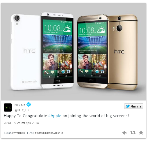 Британское отделение HTC фактически продублировало своих коллег и оставило сообщение, в котором поздравило iPhone 6 с приходом в мир больших смартфонов.
