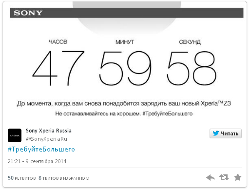 Sony Mobile разместила твит с обратным отсчетом времени, но не до собственной презентации, а до момента полной разрядки аккумулятора смартфона Xperia Z3, тем самым тонко намекнув почитателям яблочной продукции, что «шестой» iPhone уступает по этим показателям продукту компании Sony.