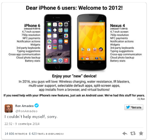 Напоследок, первый по популярности твит от Рона Амадео — редактора ресурса Arstechnika. Рон приводит сравнение iPhone 6 с Nexus 4, под которым поздравляет покупателей нового смартфона Apple с 2012 годом (тогда появился Nexus 4, параметры которого схожи с аналогичными характеристиками нового iPhone). Рон также написал, что к 2016 году в смартфонах Apple анонсируют беспроводную зарядку, виртуальные кнопки, пыле- и влагостойкость и прочее.