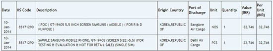 В базе данных сайта Zauba, который следит за экспортом и импортом товаров в Индии, появился неанонсированный смартфон Samsung GT-I9405. Как указано в документах, в нем используется одна SIM-карта и 5.5-дюймовый экран. В Индию он попал 10 января для тестирования.