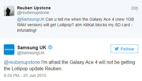 Общение рядовых пользователей с официальными представителями компаний стало в разы проще с появлением социальных сетей. Samsung нередко общается с владельцами их мобильных устройств, благодаря чему мы время от времени получаем ценную информацию о ближайших планах компании. В частности, день назад в Twitter был задан вопрос о сроках обновления прошлогоднего смартфона Samsung Galaxy Ace 4 до Android Lollipop. В ответ представитель британского подразделения компании заявил, что выпуск обновления для данного смартфона в настоящее время не запланирован.