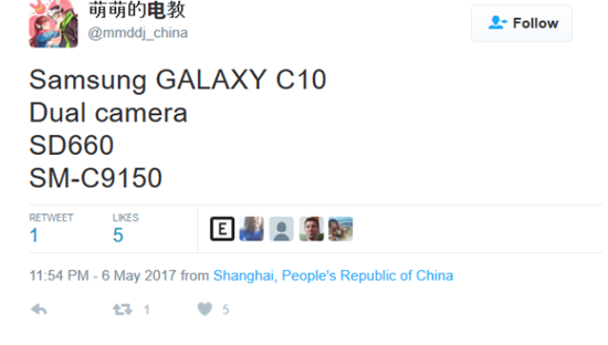 Южнокорейский гигант не отказался от идеи выпустит преемника Samsung Galaxy Note 7 и нам уже демонстрировали изображения нового поколения флагмана с двойной тыльной камерой. Ранее предполагалось, что Galaxy Note 8 удостоится титула первого смартфона Samsung с системой и двух модулей. Но впоследствии инсайдеры опровергли эти сведения, заявив, что первопроходцем станет один из новых смартфонов линейки Galaxy C. Теперь стало известно имя этого устройства — Samsung Galaxy C10. Кроме того, в сети было обнаружено первое фото смартфона.
