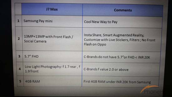 В сети появился снимок слайда презентации нового смартфона, который раскрывает его дизайн и характеристики. Сообщается, что Samsung Galaxy J7 Max обладает 5,7-дюймовым TFT‑дисплеем разрешением FullHD, восьмиядерным чипом Helio P20 (МТ6757V) с частотой 1,6 ГГц, 4 Гб оперативной памяти и 32 Гб постоянной с поддержкой карт microSD. Наделили новинку 13 МП тыльным модулем с апертурой f/1.7, селфи-камерой на 13 МП со светосилой f/1.9 и обе камеры получили в помощь светодиодную вспышку. Обладает девайс аккумулятором емкостью 3300, биометрическим датчиком и операционной системой Android 7.0 Nougat. Доступна новинка будет в черном и золотистом цветах, а ее дебют запланирован на вторую неделю июня по цене $311.