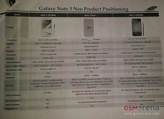 Samsung Galaxy Note 3 Neo оснащен 5,55-дюймовым HD-дисплеем Super AMOLED, 2 ГБ оперативной и 16 ГБ встроенной памяти, слотом microSD и батареей емкостью 3100 мАч. Дата начала продаж и стоимость смартфона неизвестны.