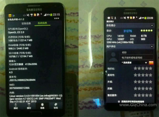 Также китайская версия Samsung Galaxy Note 3 прошла проверку AnTuTu Benchmark. Смартфон оснащен процессором Snapdragon 800 с частотой 2,2 ГГц, 2,5 Гб ОЗУ и работает на базе операционной системы Android 4.3. В бенчмарке девайс набрал 31 276 очков.