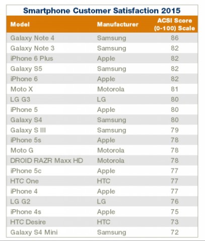 Компания American Consumer Satisfaction Index (ACSI) провела опрос 70 000 владельцев мобильных устройств из США. По результатам полученных исследований Samsung Galaxy Note 4 является тем смартфоном, которым больше всего удовлетворены пользователи на американском рынке. При шкале от 0 до 100, где 100 - это наивысшая степень удовлетворённости, американские клиенты оценили Samsung Galaxy Note 4 на 86 пунктов. Сразу за данным смартфоном расположились Galaxy Note 3, iPhone 6, iPhone 6 Plus и Samsung Galaxy S5. Данный рейтинг наглядно показывает, что американцам нравится пользоваться смартпэдами - в топе находятся устройства с диагональю экрана минимум 5,5 дюйма.