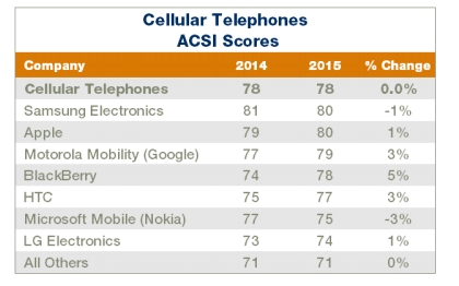 По критерию удовлетворённости брендами Apple и Samsung разделили первое место в рейтинге, получив по 80 баллов. Следом за ними идёт Motorola с 79 баллами.