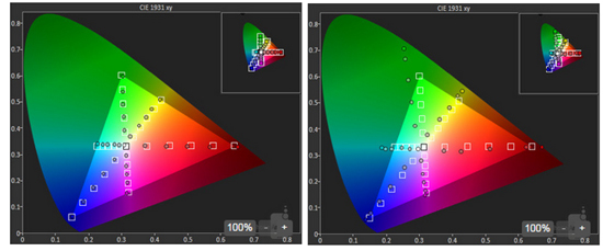 В режиме цветопередачи "Стандартный" показатель цветовой температуры достигает значения 6 596 К, что практически приблизилось к эталонному значению в 6 500 К. Это значит, что Samsung удалось достигнуть максимального баланса между красным и синим цветами, а третий зелёный цвет присутствует в достаточном количестве, а не чрезмерном, как ранее.