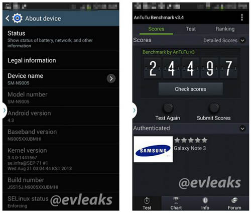 Эти скриншоты опубликовал известный всем EVleaks. По его данным, новый планшетофон Samsung SM-N9005 Galaxy Note III получит процессор с тактовой частотой 2,3 ГГц, 2,5 ГБ оперативной памяти и дисплей с разрешением 1080 х 1920 точек.