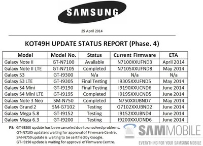 В мае обновление могут получить следующие устройства: Galaxy Note II LTE SM-N7105, Galaxy Note 3 Neo SM-N750 и Galaxy S3 LTE (некоторые устройства уже начали получать обновления на прошлой неделе). В июне обновятся Galaxy S4 mini, Galaxy Mega 5.8, Galaxy Mega 6.3 и Galaxy Grand 2.