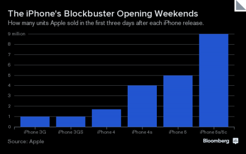Оказалось, что Apple достигает схожих результатов в течение первых недель после старта продаж нового поколения смартфонов, а в случае с iPhone 5S счет и вовсе шел на дни. На графике Bloomberg показала, сколько смартфонов каждого поколения Apple продала в течение первых трех дней после релиза. Так, за указанный срок iPhone 3G и 3GS были проданы в количестве 1 миллиона устройств, iPhone 4 - около 2 миллионов, iPhone 4S - 4 миллиона, iPhone 5 - 5 миллионов, а iPhone 5S и 5C - 9 миллионов устройств.