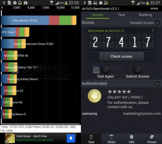 В тесте Quadrant модель GT-I9500 набрала 12726 баллов, опередив предыдущего рекордсмена HTC One. Более значительным разрыв между устройствами оказался в тесте AnTuTu, где Exynos 5 Octa в Galaxy S4 получил 27417 баллов, что на 10 процентов превышает показатель смартфона от HTC.