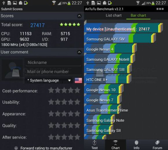 Как показало тестирование, организованное специалистами с портала SamMobile, в синтетических бенчмарках смартфон Galaxy S4 в модификации с номером модели GT-I9500, оборудованный чипсетом Exynos 5 Octa, превосходит любое из имеющихся сегодня на рынке устройств, включая своего главного конкурента в лице HTC One.