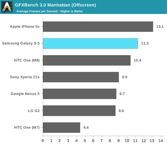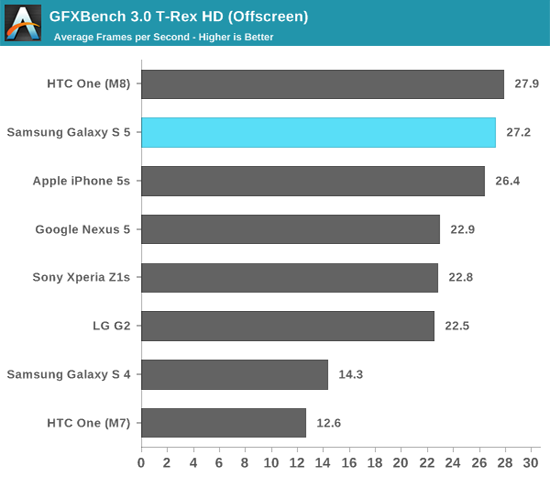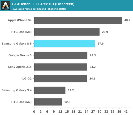 В оценках графического быстродействия опираться лучше всего не на количество бенчмарков, а на те из них, что лучше всего воспроизводят трехмерные игры. А таковым считается GFXbench T-Rex. Этот тест приведен в двух версиях – Onscreen и Offscreen. iPhone 5s с большим отрывом победил в варианте Onscreen, в то время как в Offscreen он занял третье место после HTC One M8 и Galaxy S5 с незначительным отрывом.