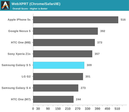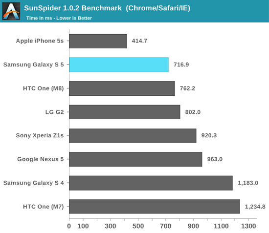 Из восьми тестов на быстродействие процессора – SunSpider, Kraken, Google Octane, WebXPRT и BaseMark – в шести лидирует iPhone 5s, в одном — Google Nexus 5 и еще в одном – HTC One M8. При этом Galaxy S5 опережает HTC One M8 в четырех тестах и уступает ему в стольких же.