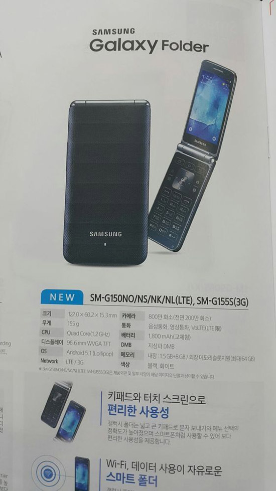 Раскладушки живы! Мы довольно редко видим их на прилавках, только совсем бюджетные модели, в то время как в азиатских странах этот форм-фактор до сих пор довольно популярен. Например, скоро в Корее Samsung начнёт продавать недорогой аппарат Galaxy Folder. Он не имеет топовых технических характеристик, какими могут похвастаться раскладушки SM-W для китайского рынка, однако тоже не очень плох. Согласно снимку из какого-то печатного каталога, Galaxy Folder получит четырёхъядерный процессор с частотой 1,2 ГГц (имеется в виду 64-битный Qualcomm Snapdragon 410), 3,8" WVGA-экран, Android 5.1 Lollipop "из коробки", 8-Мп и 2-Мп камеры, 8 ГБ постоянной и 1,5 ГБ оперативной памяти, опциональная поддержка LTE и VoLTE, батарея на 1800 мАч.