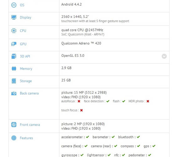 Смартфон носить модельный номер SM-G906S, что роднит его с Galaxy S5, номер которого SM-G900. Судя по результатам тестирования, новинка работает на Android 4.4.2 и оснащена процессором Qualcomm Snapdragon 805 с тактовой частотой 2,5 гигагерца и видеоускорителем Adreno 420, тремя гигабайтами оперативной памяти, 32-гигабайтным накопителем, 15-мегапиксельной камерой и экраном диагональю 5,2 дюйма при разрешении 2560×1400 пикселей.