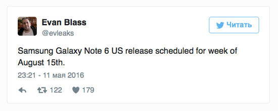 Официальная презентация нового флагманского фаблета Samsung Galaxy Note 6 состоится в августе этого года, выяснил известный искатель утечек Эван Бласс. Дата релиза устройства выбрана не случайно: в следующем месяце Apple представит смартфон iPhone 7.