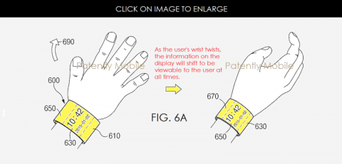 В патенте не так много информации о том, какие функции может выполнять браслет. Известно, что такое устройство сможет отображать телевизионный контент. Вполне возможно, что за счёт большего дисплея девайс сможет предлагать куда больше возможностей, нежели современные смарт-часы. Одной из интересных функций является то, что контент на браслете может автоматически "поворачиваться" к лицу пользователя в зависимости от положения руки, как это показано на рисунке ниже.