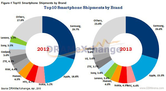 Согласно DRAMeXchange, подразделению аналитической группы TrendForce, в первом квартале 2013 года мировой рынок встретил 216,4 млн смартфонов, и почти 30% из них были поставлены Samsung. Впрочем, позиция корейского гиганта фактически не изменилась: в первой четверти 2012-го корейскими коммуникаторами было охвачено почти столько же.