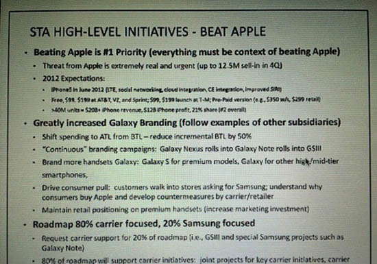 В частности, в отчете 2011 года говорится, что главной стратегией Samsung на следующий год является победа над производителем смартфонов iPhone. Основная цель корейской компании, судя по внутренним документам, – опережение на мобильном рынке Apple, которая несет серьезную угрозу бизнесу Samsung. В частности, производитель опасался дебютировавшего в то время iPhone 4s. На слайдах Сеул предполагает, что в 2012 году состоится релиз iPhone 5, который, по ожиданиям аналитиков компании, будет продан в количество 40 миллионов штук.