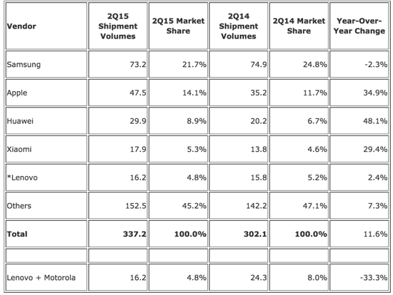 Исследовательская компания IDC опубликовала отчет рынка смартфонов за II квартал 2015 года. Согласно данным аналитиков, за год поставки устройств выросли с 302,1 до 337,2 млн штук, то есть на 11,6%. Лидером рынка смартфонов остается компания Samsung, однако за год ее доля сократилась, тогда как Apple увеличила свою долю.