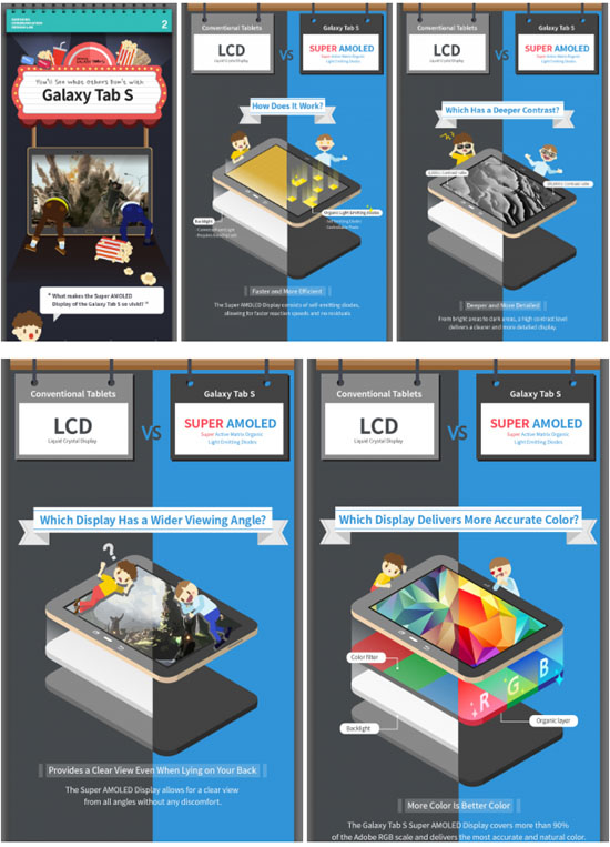 Samsung не перестаёт рассказывать публике о преимуществах своих AMOLED-дисплеев. В прошлом месяце южнокорейская компания выпустила новую линейку планшетных компьютеров Galaxy Tab S, которые обладают Super AMOLED-дисплеями с разрешением 2560х1600 пикселей. Теперь Samsung решила, не вдаваясь в технические особенности, показать с помощью инфографики преимущество экрана, изготовленного по технологии AMOLED, перед LCD-дисплеями.